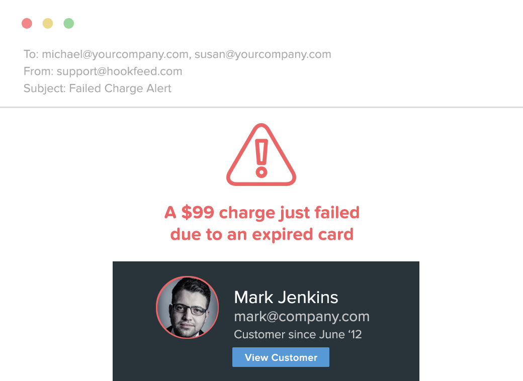 Some things warrant your immediate attention. Choose which events (failed charges, new charges, disputes etc.) you want to know about and we'll let you know instantly any time it happens.