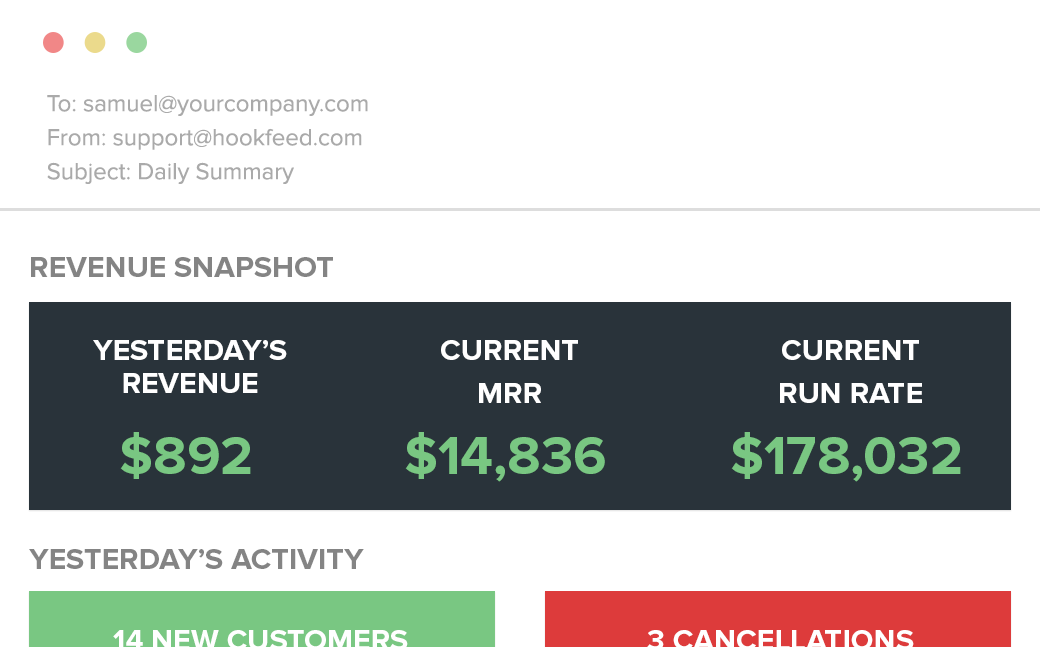 Get daily/weekly email summaries of your revenue vitals and action items. Stay focused on what's most important to you, and let us deliver the goods of just what you need to know.